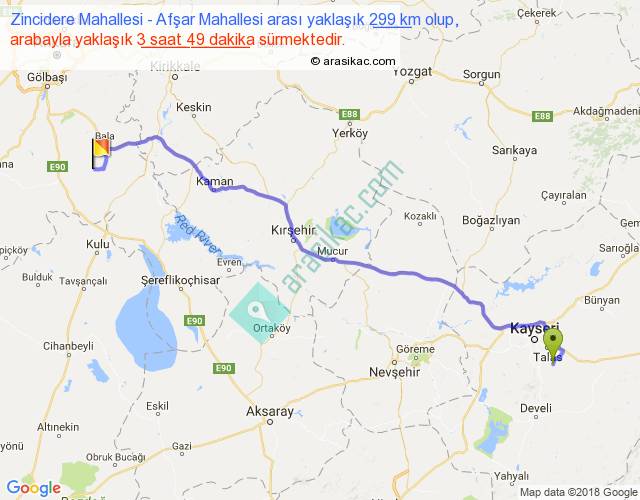 Zincidere Mahallesi - Afşar Mahallesi arası yaklaşık olarak 90 km/h ile yukarıda belirtilen sürede olup, iki yerin kuş uçuşu uzaklığı (mesafesi) 235'dir. Yolculuk otobüsle 4 saat 57 dakika sürmektedir.