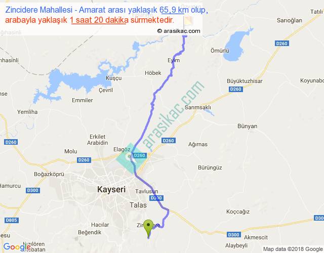 Zincidere Mahallesi - Amarat arası yaklaşık olarak 90 km/h ile yukarıda belirtilen sürede olup, iki yerin kuş uçuşu uzaklığı (mesafesi) 49'dir. Yolculuk otobüsle 1 saat 44 dakika sürmektedir.