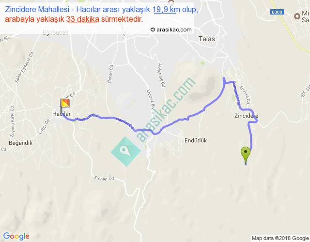 Zincidere Mahallesi - Hacılar arası yaklaşık olarak 90 km/h ile yukarıda belirtilen sürede olup, iki yerin kuş uçuşu uzaklığı (mesafesi) 12'dir. Yolculuk otobüsle 42 dakika sürmektedir.