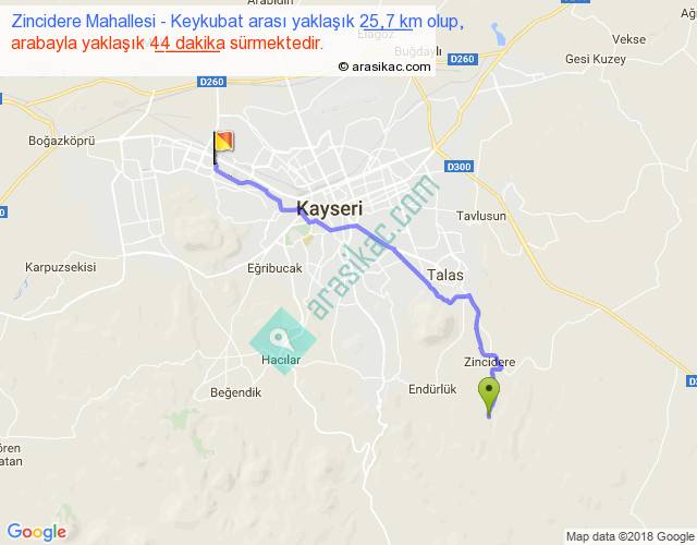 Zincidere Mahallesi - Keykubat arası yaklaşık olarak 90 km/h ile yukarıda belirtilen sürede olup, iki yerin kuş uçuşu uzaklığı (mesafesi) 20'dir. Yolculuk otobüsle 57 dakika sürmektedir.