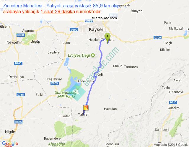 Zincidere Mahallesi - Yahyalı arası yaklaşık olarak 90 km/h ile yukarıda belirtilen sürede olup, iki yerin kuş uçuşu uzaklığı (mesafesi) 61'dir. Yolculuk otobüsle 1 saat 54 dakika sürmektedir.