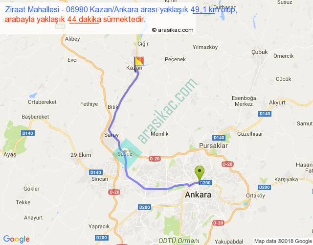 Ziraat Mahallesi - 06980 Kazan Ankara arası yaklaşık olarak 90 km/h ile yukarıda belirtilen sürede olup, iki yerin kuş uçuşu uzaklığı (mesafesi) 31'dir. Yolculuk otobüsle 57 dakika sürmektedir.