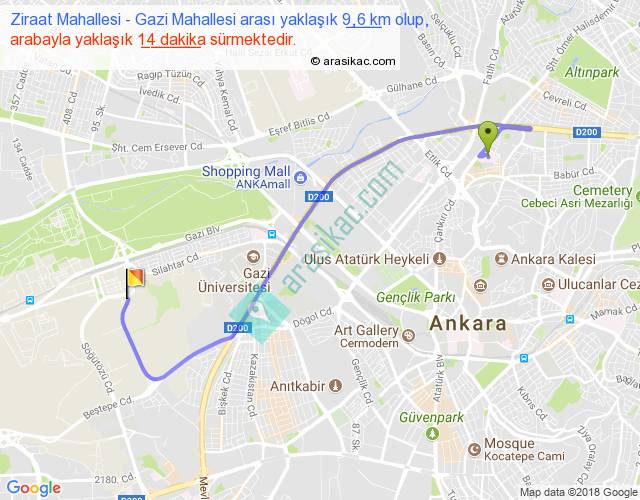 Ziraat Mahallesi - Gazi Mahallesi arası yaklaşık olarak 90 km/h ile yukarıda belirtilen sürede olup, iki yerin kuş uçuşu uzaklığı (mesafesi) 6'dir. Yolculuk otobüsle 18 dakika sürmektedir.