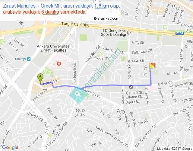 Ziraat Mahallesi - Örnek Mh. arası yaklaşık olarak 90 km/h ile yukarıda belirtilen sürede olup, iki yerin kuş uçuşu uzaklığı (mesafesi) 1'dir. Yolculuk otobüsle 7 dakika sürmektedir.