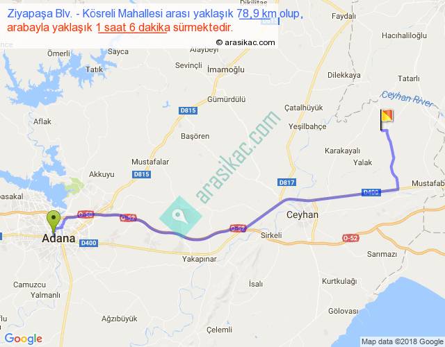 Ziyapaşa Blv. - Kösreli Mahallesi arası yaklaşık olarak 90 km/h ile yukarıda belirtilen sürede olup, iki yerin kuş uçuşu uzaklığı (mesafesi) 60'dir. Yolculuk otobüsle 1 saat 25 dakika sürmektedir.
