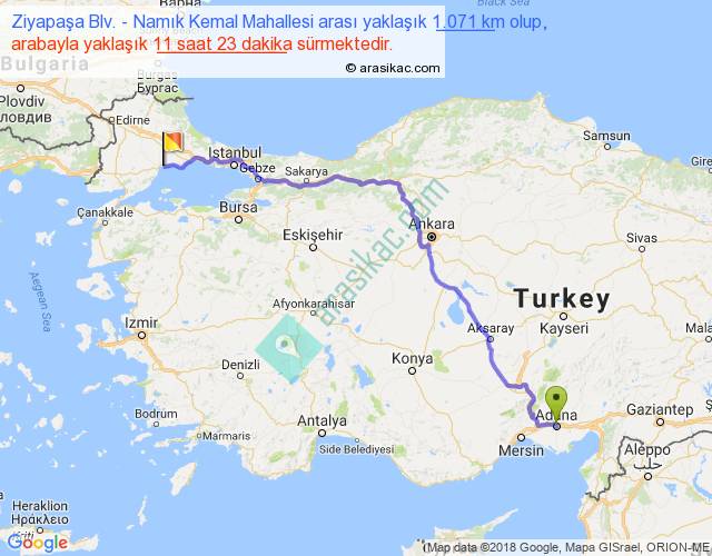 Ziyapaşa Blv. - Namık Kemal Mahallesi arası yaklaşık olarak 90 km/h ile yukarıda belirtilen sürede olup, iki yerin kuş uçuşu uzaklığı (mesafesi) 797'dir. Eğer belirtilen yerler arasında uçak seferi var ise bu süre uçakla 1 saat 13 dakika'ya kadar düşebilir. Yolculuk otobüsle 14 saat 47 dakika sürmektedir.