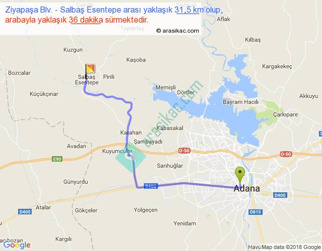 Ziyapaşa Blv. - Salbaş Esentepe arası yaklaşık olarak 90 km/h ile yukarıda belirtilen sürede olup, iki yerin kuş uçuşu uzaklığı (mesafesi) 22'dir. Yolculuk otobüsle 46 dakika sürmektedir.