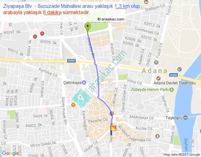 Ziyapaşa Blv. - Sucuzade Mahallesi arası yaklaşık olarak 90 km/h ile yukarıda belirtilen sürede olup, iki yerin kuş uçuşu uzaklığı (mesafesi) 1'dir. Yolculuk otobüsle 7 dakika sürmektedir.