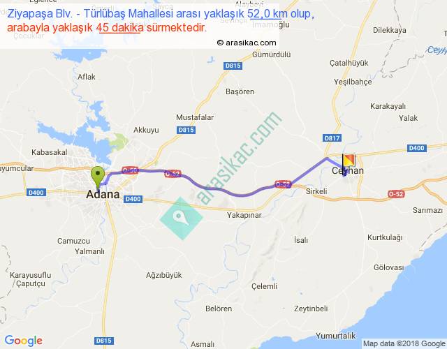 Ziyapaşa Blv. - Türlübaş Mahallesi arası yaklaşık olarak 90 km/h ile yukarıda belirtilen sürede olup, iki yerin kuş uçuşu uzaklığı (mesafesi) 43'dir. Yolculuk otobüsle 58 dakika sürmektedir.