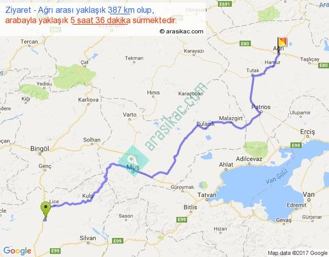 Ziyaret - Ağrı arası yaklaşık olarak 90 km/h ile yukarıda belirtilen sürede olup, iki yerin kuş uçuşu uzaklığı (mesafesi) 263'dir. Eğer belirtilen yerler arasında uçak seferi var ise bu süre uçakla 24 dakika'ya kadar düşebilir. Yolculuk otobüsle 7 saat 16 dakika sürmektedir.