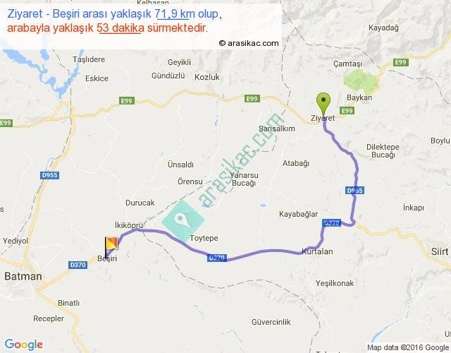 Ziyaret - Beşiri arası yaklaşık olarak 90 km/h ile yukarıda belirtilen sürede olup, iki yerin kuş uçuşu uzaklığı (mesafesi) 44'dir. Yolculuk otobüsle 1 saat 8 dakika sürmektedir.