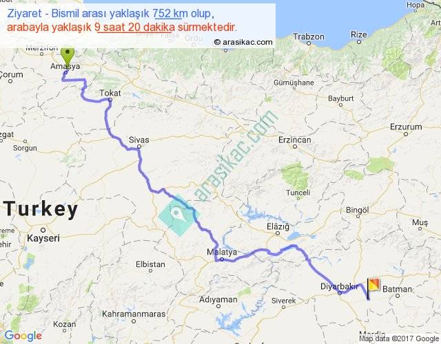 Ziyaret - Bismil arası yaklaşık olarak 90 km/h ile yukarıda belirtilen sürede olup, iki yerin kuş uçuşu uzaklığı (mesafesi) 517'dir. Eğer belirtilen yerler arasında uçak seferi var ise bu süre uçakla 47 dakika'ya kadar düşebilir. Yolculuk otobüsle 12 saat 8 dakika sürmektedir.