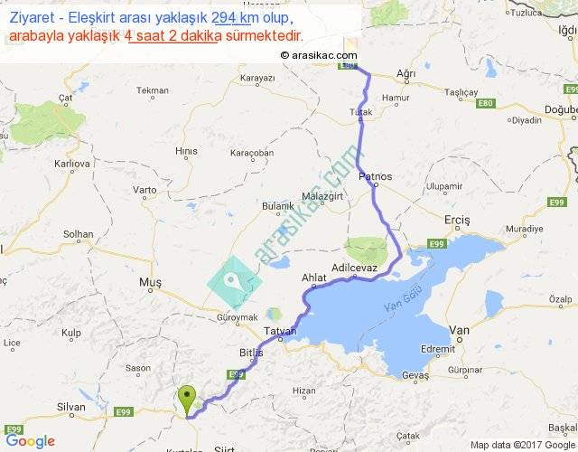 Ziyaret - Eleşkirt arası yaklaşık olarak 90 km/h ile yukarıda belirtilen sürede olup, iki yerin kuş uçuşu uzaklığı (mesafesi) 202'dir. Yolculuk otobüsle 5 saat 14 dakika sürmektedir.