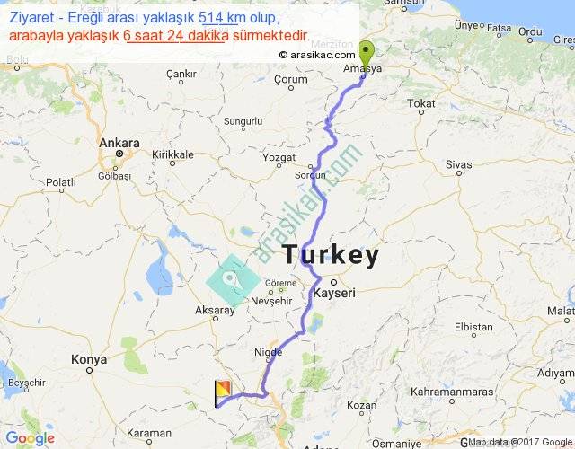 Ziyaret - Ereğli arası yaklaşık olarak 90 km/h ile yukarıda belirtilen sürede olup, iki yerin kuş uçuşu uzaklığı (mesafesi) 384'dir. Eğer belirtilen yerler arasında uçak seferi var ise bu süre uçakla 35 dakika'ya kadar düşebilir. Yolculuk otobüsle 8 saat 19 dakika sürmektedir.