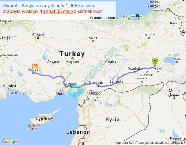 Ziyaret - Konya arası yaklaşık olarak 90 km/h ile yukarıda belirtilen sürede olup, iki yerin kuş uçuşu uzaklığı (mesafesi) 803'dir. Eğer belirtilen yerler arasında uçak seferi var ise bu süre uçakla 1 saat 14 dakika'ya kadar düşebilir. Yolculuk otobüsle 13 saat 42 dakika sürmektedir.