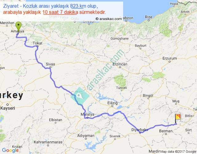 Ziyaret - Kozluk arası yaklaşık olarak 90 km/h ile yukarıda belirtilen sürede olup, iki yerin kuş uçuşu uzaklığı (mesafesi) 553'dir. Eğer belirtilen yerler arasında uçak seferi var ise bu süre uçakla 51 dakika'ya kadar düşebilir. Yolculuk otobüsle 13 saat 9 dakika sürmektedir.