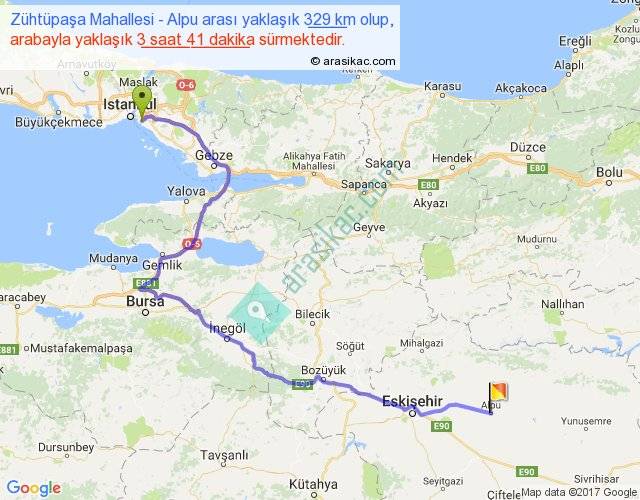 Zühtüpaşa Mahallesi - Alpu arası yaklaşık olarak 90 km/h ile yukarıda belirtilen sürede olup, iki yerin kuş uçuşu uzaklığı (mesafesi) 211'dir. Yolculuk otobüsle 4 saat 47 dakika sürmektedir.