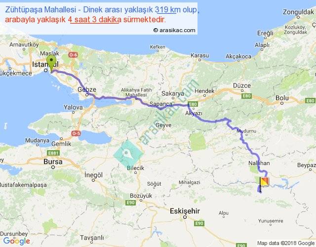 Zühtüpaşa Mahallesi - Dinek arası yaklaşık olarak 90 km/h ile yukarıda belirtilen sürede olup, iki yerin kuş uçuşu uzaklığı (mesafesi) 226'dir. Yolculuk otobüsle 5 saat 15 dakika sürmektedir.