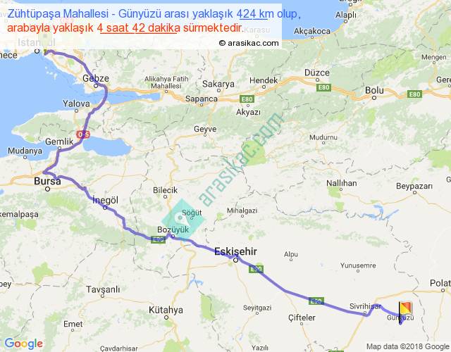 Zühtüpaşa Mahallesi - Günyüzü arası yaklaşık olarak 90 km/h ile yukarıda belirtilen sürede olup, iki yerin kuş uçuşu uzaklığı (mesafesi) 294'dir. Eğer belirtilen yerler arasında uçak seferi var ise bu süre uçakla 27 dakika'ya kadar düşebilir. Yolculuk otobüsle 6 saat 6 dakika sürmektedir.