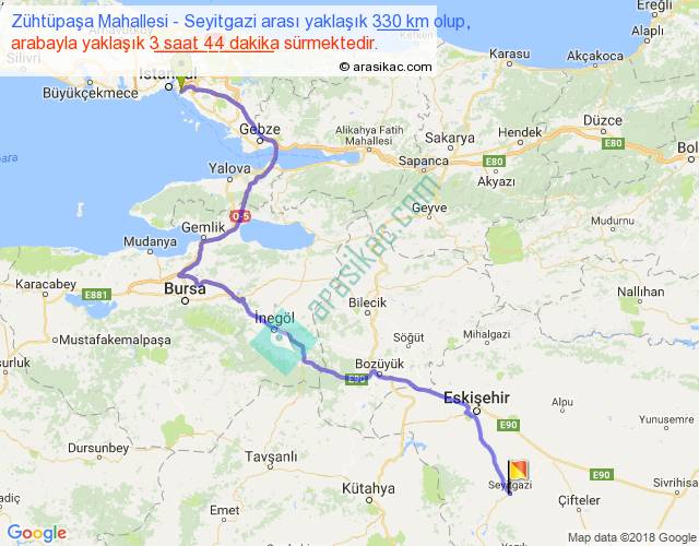 Zühtüpaşa Mahallesi - Seyitgazi arası yaklaşık olarak 90 km/h ile yukarıda belirtilen sürede olup, iki yerin kuş uçuşu uzaklığı (mesafesi) 220'dir. Yolculuk otobüsle 4 saat 51 dakika sürmektedir.