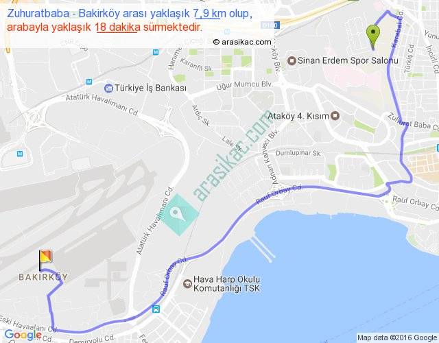 Zuhuratbaba - Bakirköy arası yaklaşık olarak 90 km/h ile yukarıda belirtilen sürede olup, iki yerin kuş uçuşu uzaklığı (mesafesi) 4'dir. Yolculuk otobüsle 23 dakika sürmektedir.