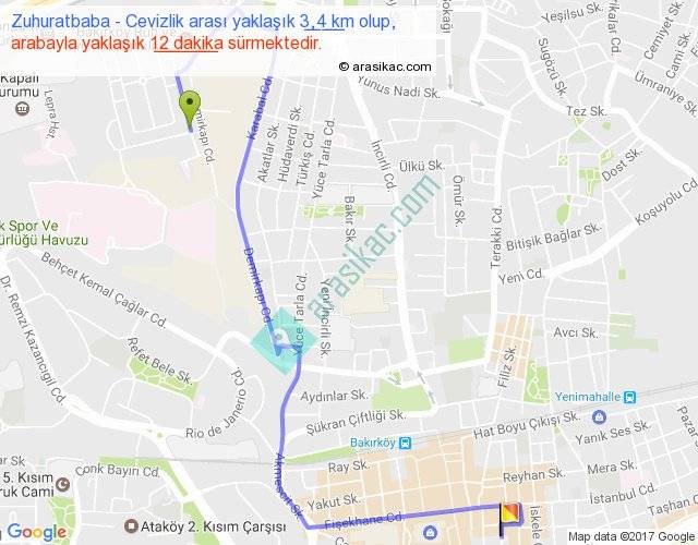 Zuhuratbaba - Cevizlik arası yaklaşık olarak 90 km/h ile yukarıda belirtilen sürede olup, iki yerin kuş uçuşu uzaklığı (mesafesi) 2'dir. Yolculuk otobüsle 15 dakika sürmektedir.