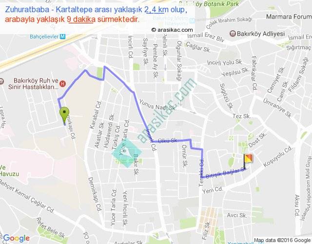 Zuhuratbaba - Kartaltepe arası yaklaşık olarak 90 km/h ile yukarıda belirtilen sürede olup, iki yerin kuş uçuşu uzaklığı (mesafesi) 1'dir. Yolculuk otobüsle 11 dakika sürmektedir.