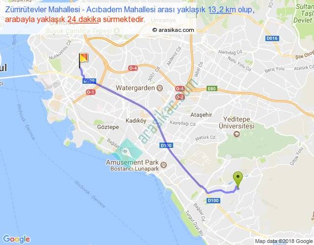 Zümrütevler Mahallesi - Acıbadem Mahallesi arası yaklaşık olarak 90 km/h ile yukarıda belirtilen sürede olup, iki yerin kuş uçuşu uzaklığı (mesafesi) 12'dir. Yolculuk otobüsle 31 dakika sürmektedir.