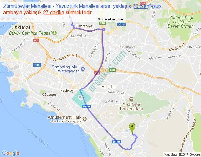 Zümrütevler Mahallesi - Yavuztürk Mahallesi arası yaklaşık olarak 90 km/h ile yukarıda belirtilen sürede olup, iki yerin kuş uçuşu uzaklığı (mesafesi) 12'dir. Yolculuk otobüsle 35 dakika sürmektedir.