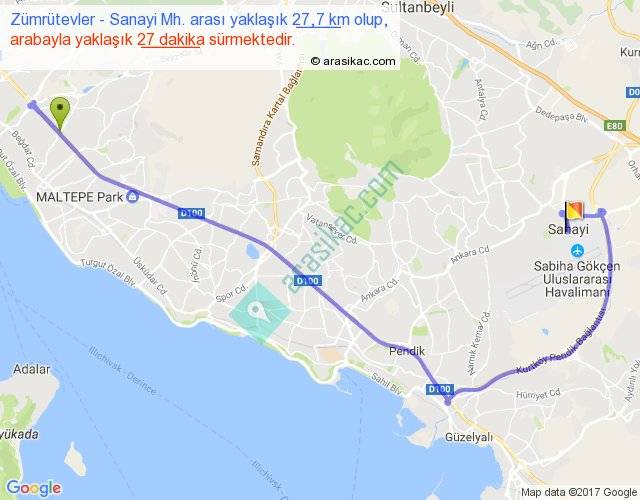 Zümrütevler - Sanayi Mh. arası yaklaşık olarak 90 km/h ile yukarıda belirtilen sürede olup, iki yerin kuş uçuşu uzaklığı (mesafesi) 15'dir. Yolculuk otobüsle 35 dakika sürmektedir.